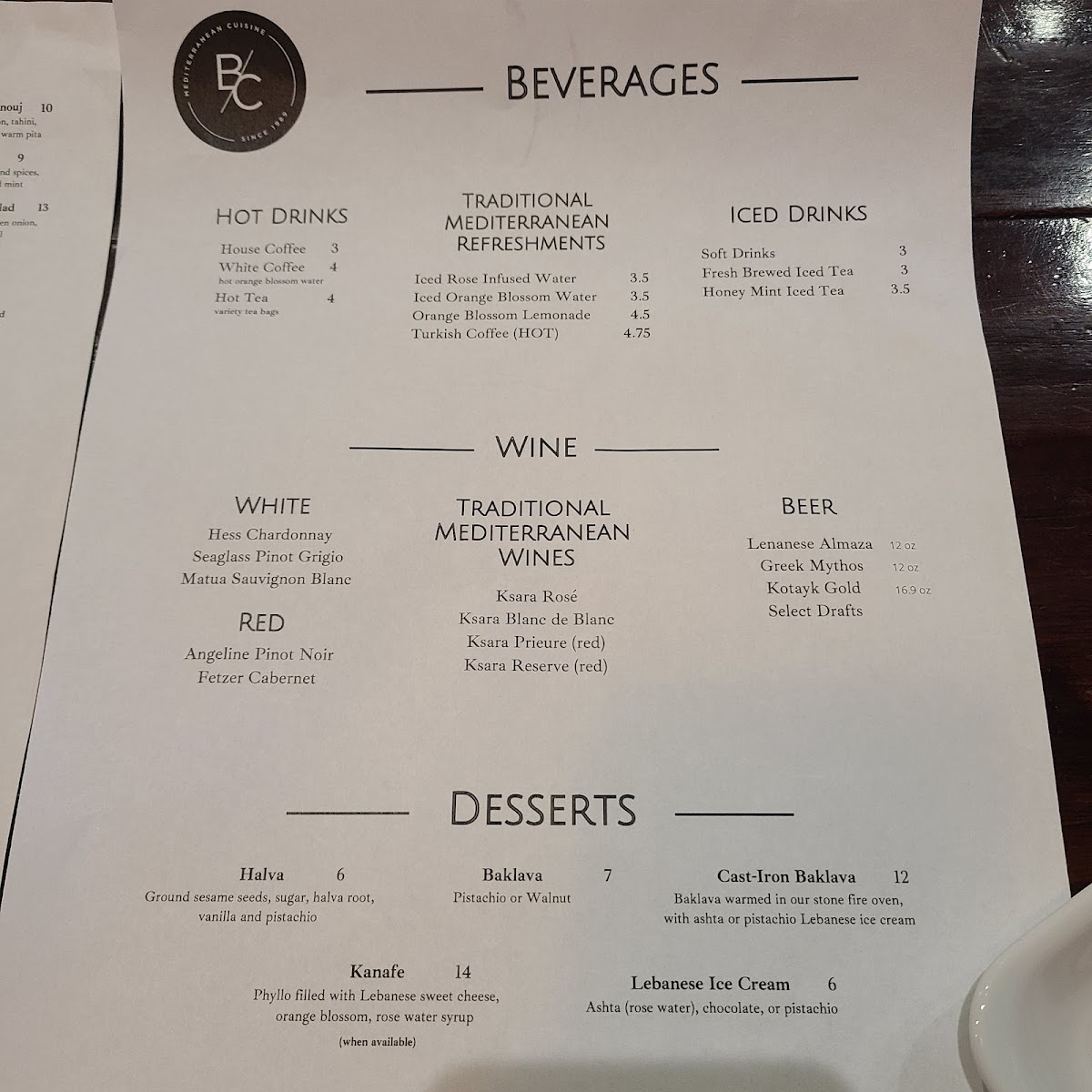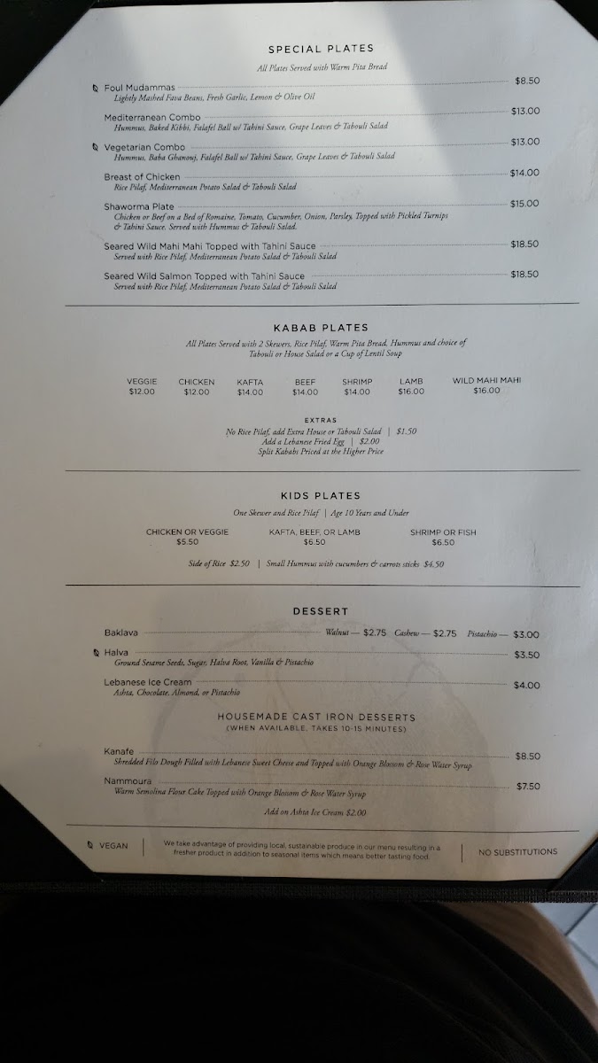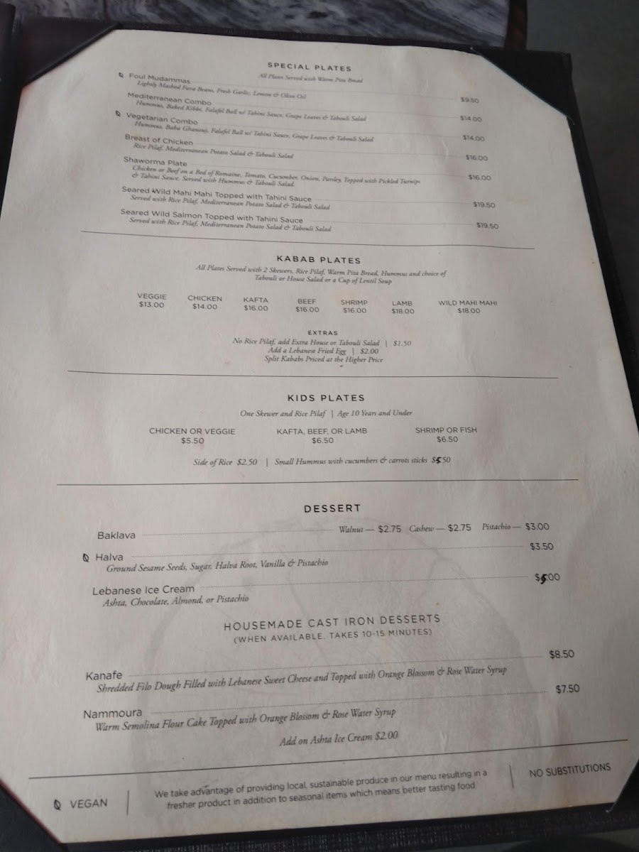 Desserts include options such as pistachio baklava and kunafa, offering typical Mediterranean sweets to complement the meal.